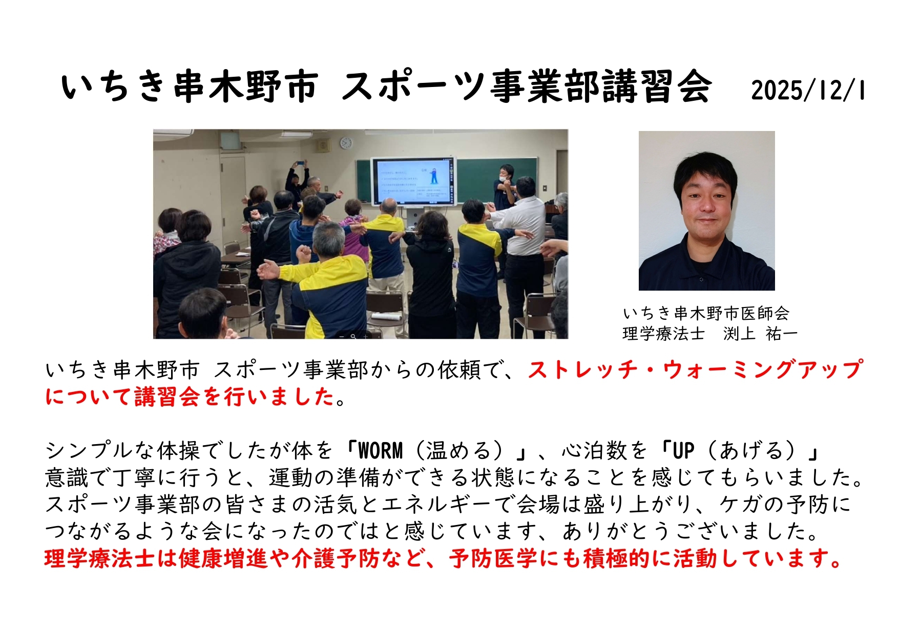 いちき串木野市スポーツ事業部へ、当院の理学療法士よりストレッチ・ウォーミングアップについて講習を行いました。